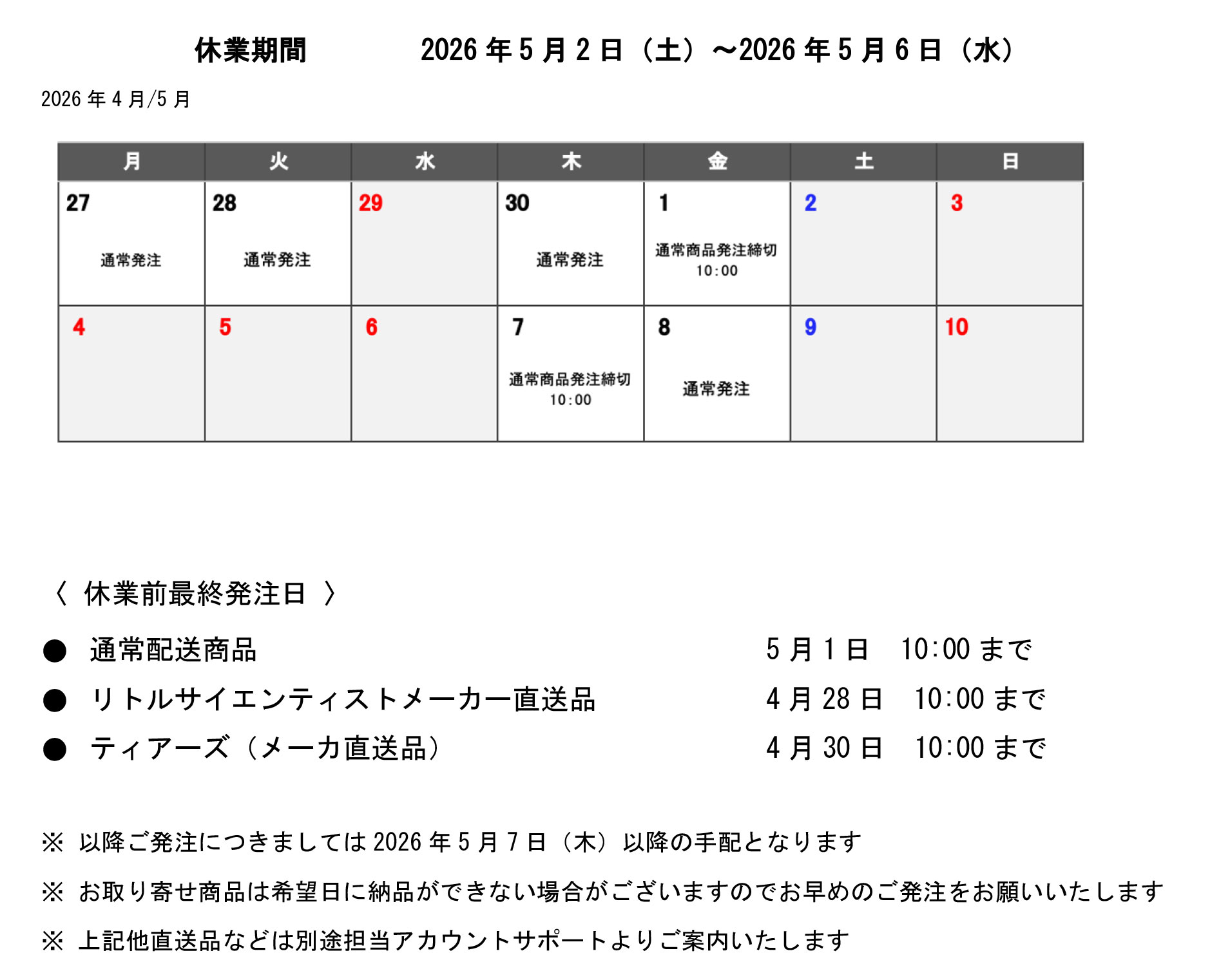 ゴールデンウィーク休業および移転作業による出荷停止のお知らせ